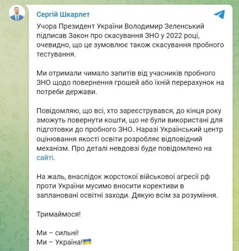 "Президент України Володимир Зеленський підписав Закон про скасування ЗНО у 2022 році, очевидно, що це зумовлює також скасування пробного тестування.