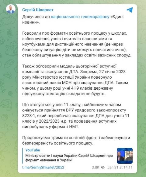 "Обговорили модель цьогорічної вступної кампанії та скасування ДПА. Зокрема, 27 січня 2023 року Міністерство юстиції України повернуло заюстований наказ МОН про скасування ДПА. Таким чином, у цьому році учні 4 і 9 класів державну підсумкову атестацію складати не будуть" – наголосив Шкарлет.