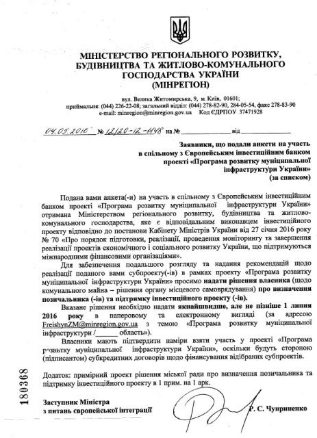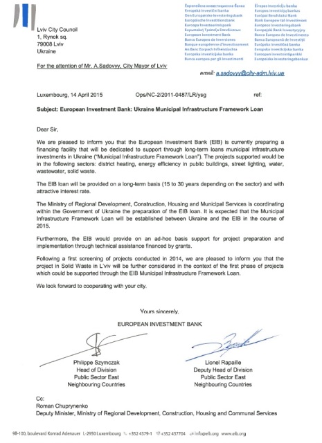 Зазначимо, 23 липня 2015 року була підписана угода між Україною та Європейським інвестиційним банком, якою передбачено в рамках реалізації Програми залучення кредиту для модернізації інфраструктури житлово-комунального господарства України виділення 400 млн євро кредиту.