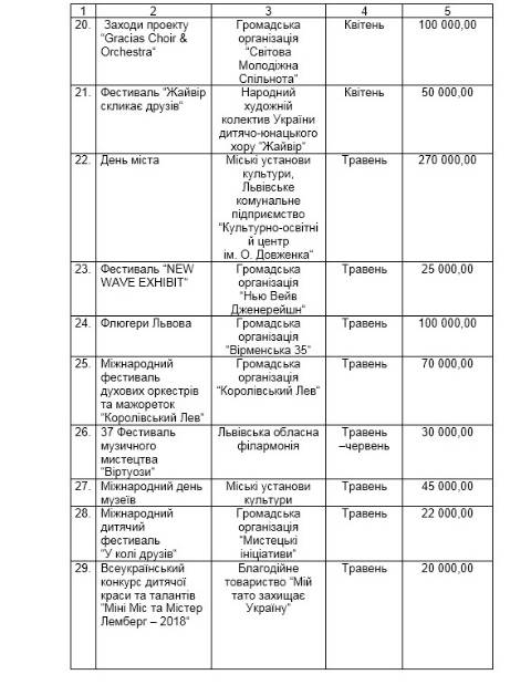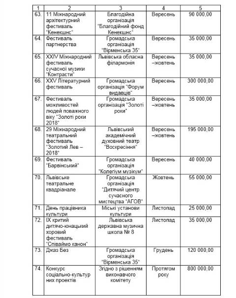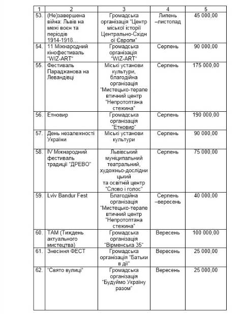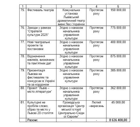 Найбільше коштів, 875 000 грн, виділили на відзначення ювілеїв, визначних та пам’ятних дат. Ще 800 000 грн – на конкурс соціально-культурних проектів та 775 000 грн – на заходи в межах Стратегії культури 2025.