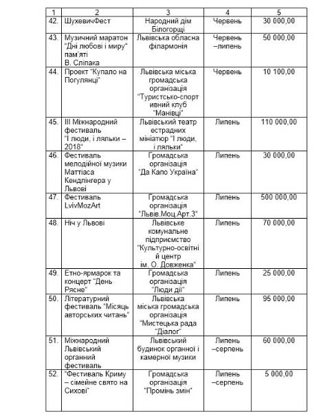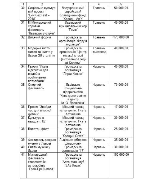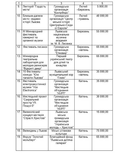 На фестиваль LvivMozArt, який відбудеться у липні, у бюджеті Львова передбачили 500 000 грн; на Літературний фестиваль, що пройде у вересні, – 300 000 грн; на відзначення Дня міста – 270 000 грн.