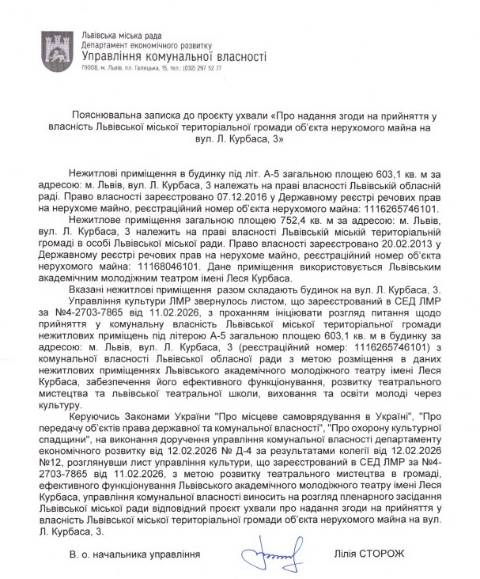 Як вказано у документі, міськрада планує прийняти у комунальну власність 603,1 м² приміщень облради й передати їх у користування театру.
