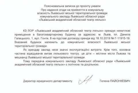 Згідно з документом, через це театр несе значні витрати, тому передача закладу у власність громади Львова є "логічною та доцільною".
