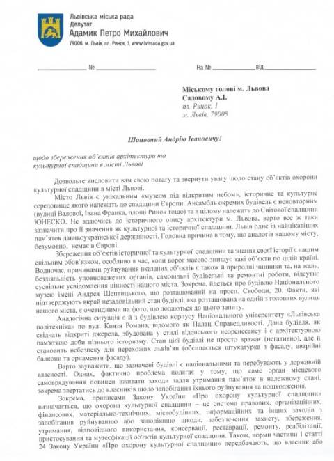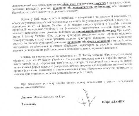 Зазначимо, у своєму запиті до міськради Петро Адамик наголошував, що пам'ятки архітектури – будівля Національного музею імені Андрея Шептицького на проспекті Свободи 20 та будівля НУ "Львівська політехніка" на вул. Князя Романа, 1-3, перебувають у незадовільному стані й руйнуються.