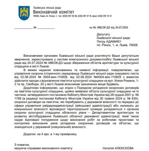 Про це йдеться у відповіді Львівської міської ради на запит депутата міськради Львова, керівника фракції Європейська Солідарність Петра Адамика від 24 липня 2024 року щодо збереження об’єктів архітектури та культурної спадщини у Львові.