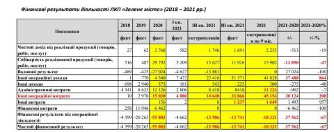 Зазначимо, результатом діяльності ЛКП "Зелене місто" є збиток, який становив 4 399 тис. грн у 2018 році, 20 263 тис. грн у 2019 році, 55 883 тис. грн у 2020 році.