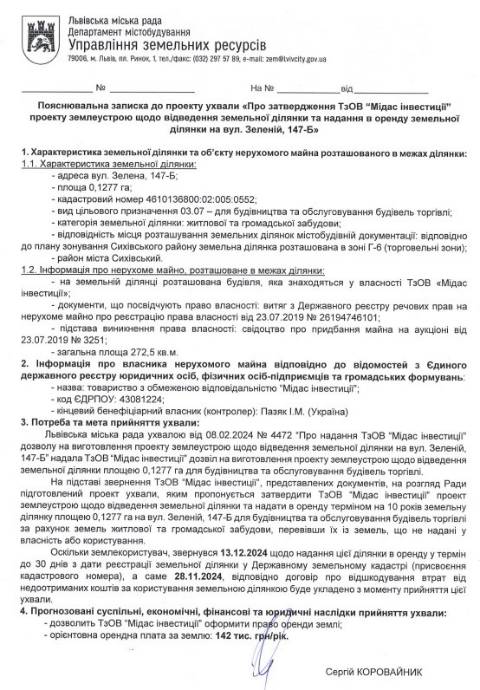 "Затвердити ТзОВ "Мідас інвестиції" проект землеустрою щодо відведення земельної ділянки та надати земельну ділянку площею 0,1277 га на вул. Зеленій, 147-Б в оренду терміном на 10 років для будівництва та обслуговування будівель торгівлі за рахунок земель житлової та громадської забудови, перевівши їх із земель, що не надані у власність або користування" – йдеться в ухвалі.