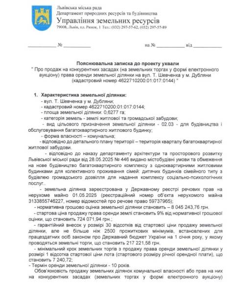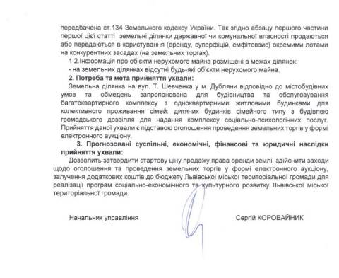 "Продати переможцю земельних торгів у формі електронного аукціону право оренди земельної ділянки площею 0,6277 га на вул. Т. Шевченка у м. Дубляни для будівництва і обслуговування багатоквартирного комплексу з одноквартирними житловими будинками для колективного проживання сімей: дитячих будинків сімейного типу з будівлею громадського дозвілля для надання комплексу соціально-психологічних послуг на конкурентних засадах" – йдеться в ухвалі.