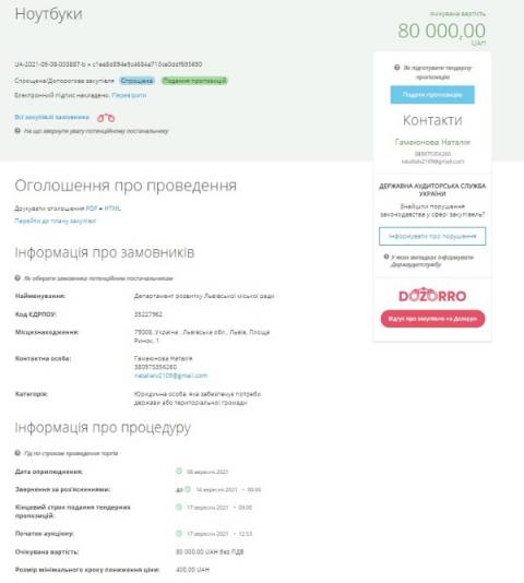 Департамент розвитку Львівської міської ради оголосив закупівлю у системі ProZorro на придбання ноутбуків, яку переможець тендеру має доставити до 31 грудня 2021 року.