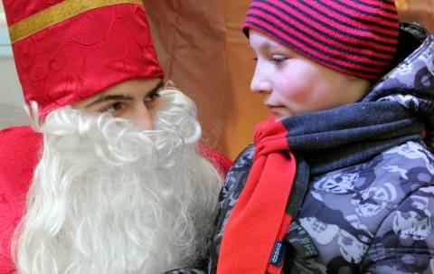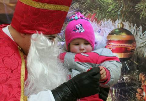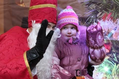 На площі Ринок у Львові діти сиділи на колдінах у Миколая, розповідали йому як поводились цілий рік та отримували цукерки.
