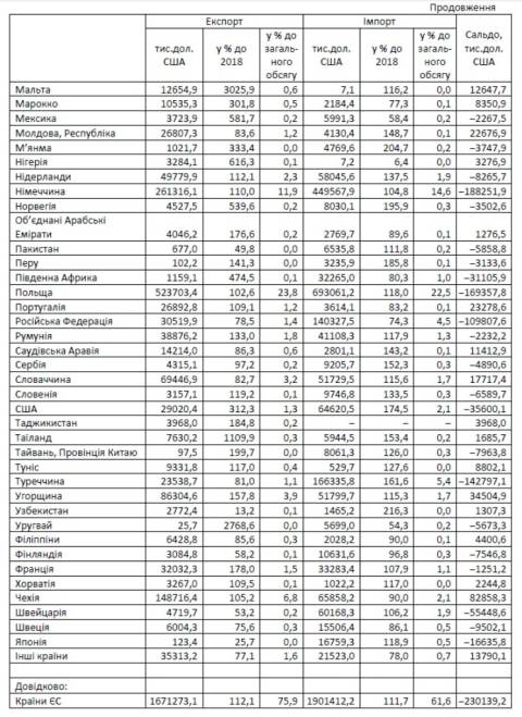 Зовнішньоторговельні операції здійснювались із партнерами із 172 країнами світу. Найбільші частки експортованої продукції припали на Польщу (23,8% від загальнообласного експорту), Німеччину (11,9%) та Чехію (6,8%). Експорт товарів у країни Євросоюзу становив 1671,3 млн дол (75,9%) та збільшився, порівняно з 2018 роком, на 12,1%.