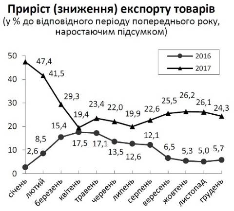 Зростання експорту зумовлене збільшенням, порівняно з 2016 роком, поставок цукру і кондитерських виробів з цукру в 2,8 раза, меблів – на 50,6%, електротехнічного обладнання – на 29,4%, жирів та олій – на 23,1%.