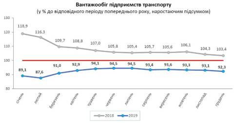 Вантажооборот підприємств транспорту становив 10,5 млрд.ткм і, порівняно з 2018 роком, зменшився на 7,7%.