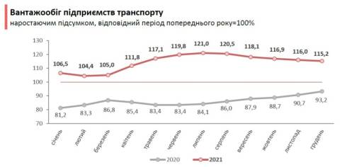 Вантажооборот підприємств транспорту становив 11237,4 млн.ткм і, порівняно з 2020 роком, збільшився на 15,2%.