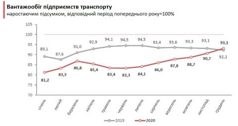 Вантажооборот підприємств транспорту становив 9743,7 млн.ткм і, порівняно з 2019 роком, зменшився на 6,9%.