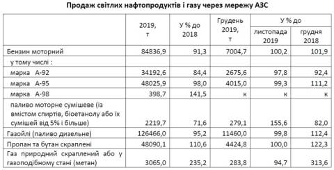 Зокрема, дизельного палива продали 126,5 тис.т, що на 4,8% менше, ніж у 2018 році, бензину моторного – 84,8 тис.т (на 8,7% менше), пропану і бутану скраплених – 48,1 тис.т (на 10,6% більше).