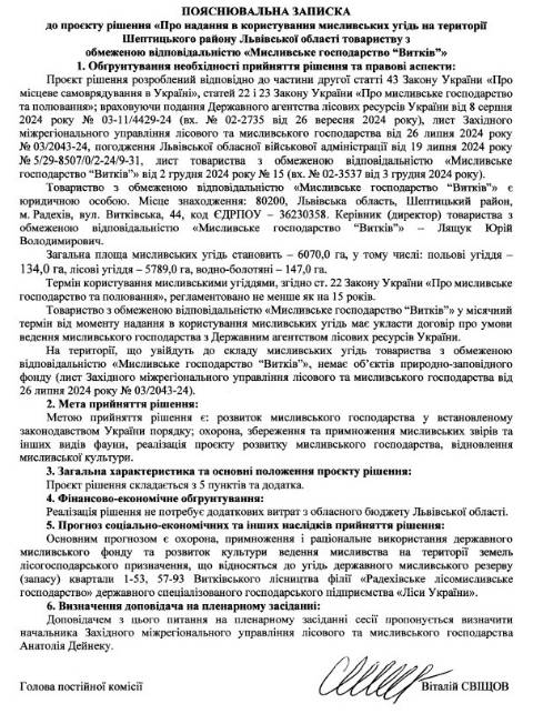 Комісія з питань з питань екології, природних ресурсів Львівської обласної ради 13 червня цього року зареєструвала проєкт рішення про надання в користування мисливських угідь на території Шептицького району ТзОВ "Мисливське господарство "Витків".
