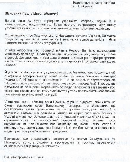 Культурні та інтелектуальні кола Львова скерували звернення до Народного артиста України Павла Зіброва, у зв'язку з його зйомками в рекламі сумнівних лотерей, що в більшості асоціюються із гральним бізнесом.