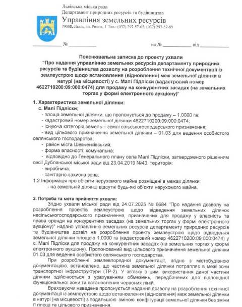 На сайті Львівської міськради оприлюднили проєкт ухвали, якою пропонують надати управлінню земельних ресурсів дозволу на розроблення технічної документації із землеустрою щодо встановлення меж земельної ділянки у селі Малі Підліски для продажу на земельних торгах у формі електронного аукціону.