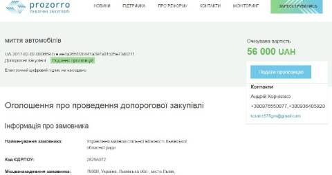 Львівська обласна рада оголосила аукціон на миття авто, кошти на це виділені з бюджету на 2017 рік.