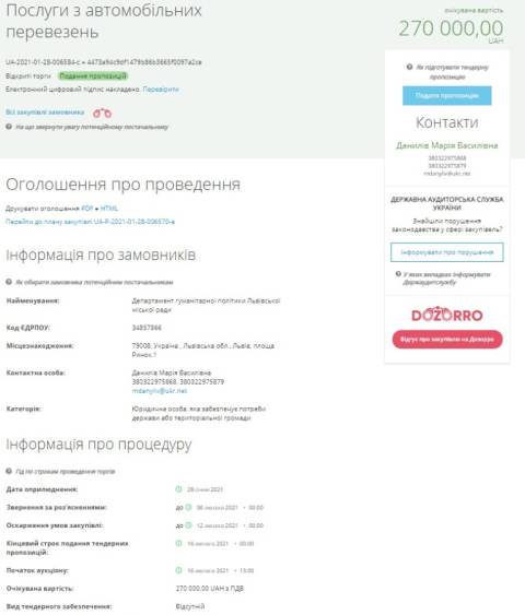 Департамент гуманітарної політики Львівської міської ради оголосив тендер у системі ProZorro на послуги з автомобільних перевезень, які переможець тендеру має поставляти до 31 грудня 2021 року.