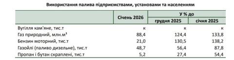 Натомість підприємства, установи та населення Львівщини у січні використали 88,4 млн. м³природного газу, 48,7 тис.т газойлів, 21 тис.т бензину, 5,2 тис.т пропану і бутану скраплених.