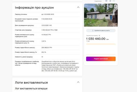 Аукціон стартує 12 лютого, а початкова вартість приміщення становить 1 030 440 грн.