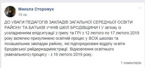 З 12 до 17 лютого усі школи та дитячі садочки Бродівського району закрили на карантин через епідемію грипу.