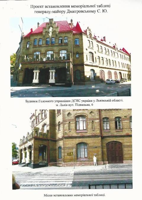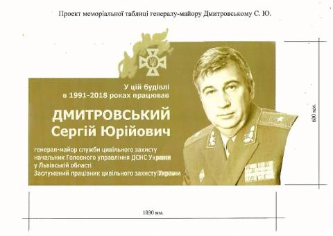 На фасаді будинку на вул. Підвальній, 6, де знаходиться Головне управління Державної служби України з надзвичайних ситуацій у Львівській області, встановлять меморіальну таблицю Сергію Дмитровському, колишньому начальнику ДСНС ЛЬвівщини.