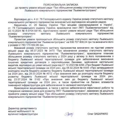 У пояснювальній записці до проєкту ухвали вказано, що поповнення статутного капіталу цього підприємства з бюджету Львова зумовлене намаганням забезпечити ефективну роботу та створенням належних умов для його розвитку.