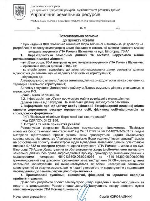 "Надати ЛКП "Львівське міжміське бюро технічної інвентаризації" дозвіл на розроблення проєкту землеустрою щодо відведення земельної ділянки орієнтовною площею 0,1642 га навпроти музею генерал-хорунжого УПА Романа Шухевича на вул. Білогорщі, 76-А для облаштування та обслуговування скверу за рахунок земель, що не надані у власність або користування, з подальшим переведенням їх до земель рекреаційного призначення" – вказано в проєкті ухвали.