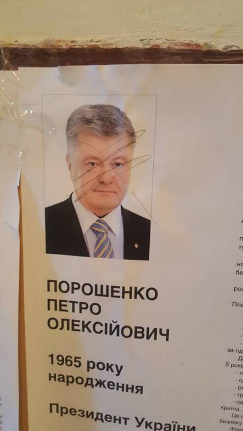 Сьогодні на виборчій дільниці у Львові виборці зіпсували зображення кандидата у президенти, чинниого президента Петра Порошенка на інформаційному плакаті.