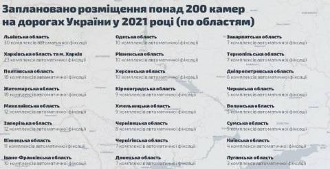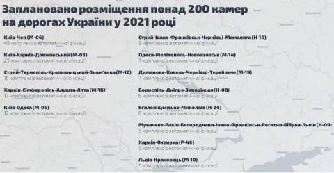 Зокрема, по камер автофіксації порушень ПДР працюватимуть на ділянках трас Львів – Краковець і Мукачеве – Львів, 8 – на трасі Стрий – Івано-Франківськ – Чернівці – Мамалига, 15 – на трасі Стрий – Тернопіль – Кропивницький – Знам'янка, 49 – на трасі Київ – Чоп.