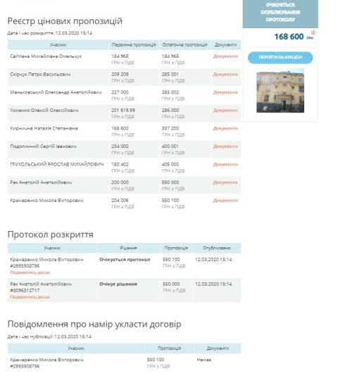 Повторний аукціон стартував 12 березня, участь у ньому взяли дев'ять осіб ,а переможцем обрали Миколу Крамаренка із найвищою пропозицією у 550 100 грн.