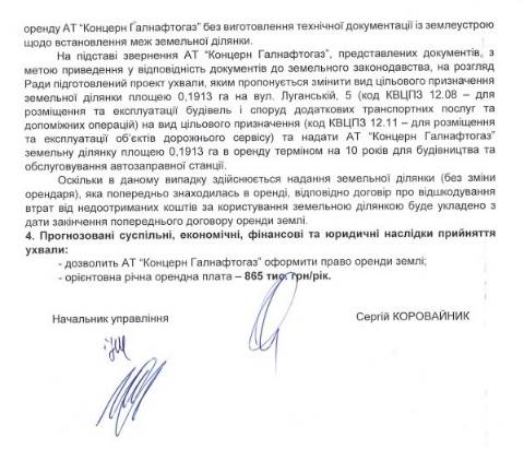 "Надати АТ "Концерн Галнафтогаз" земельну ділянку площею 0,1913 га на вул. Луганській, 5 в оренду терміном на 10 років для будівництва та обслуговування автозаправної станції" – йдеться в ухвалі.