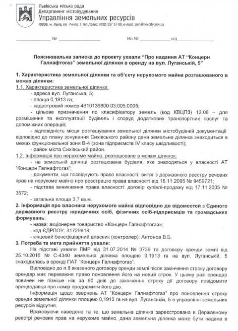 Згідно з документом, йдеться про ділянку площею 0,1913 га, що знаходиться на вул. Луганській, 5 у Сихівському районі Львова й перебуває у комунальній власності Львова. На цій ділянці є будівля площею 3,7 м², що перебуває у приватній власності АТ "Концерн Галнафтогаз".