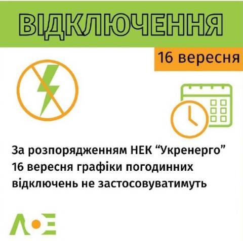 "За розпорядженням НЕК "Укренерго" 16 вересня серпня погодинні відключення не застосовуватимуться" – йдеться у повідомленні.