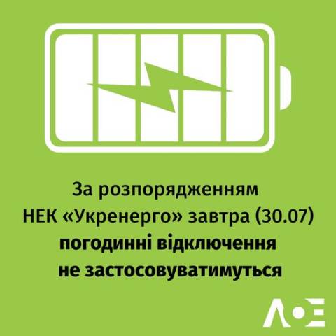 "За розпорядженням НЕК "Укренерго" 30 липня погодинні відключення не застосовуватимуться" – йдеться у повідомленні.
