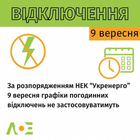 "За розпорядженням НЕК "Укренерго" 9 вересня серпня погодинні відключення не застосовуватимуться" – йдеться у повідомленні.