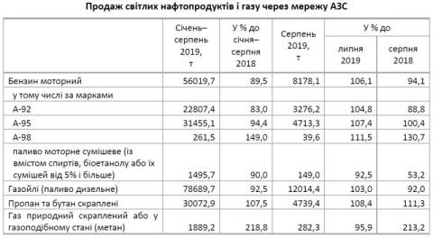 Зокрема, дизельного палива продали 78,7 тис.т, що на 7,5% менше, ніж у ці місяці 2018 року, бензину моторного – 56 тис.т (на 10,5% менше), пропану і бутану скраплених – 30,1 тис.т (на 7,5% більше).