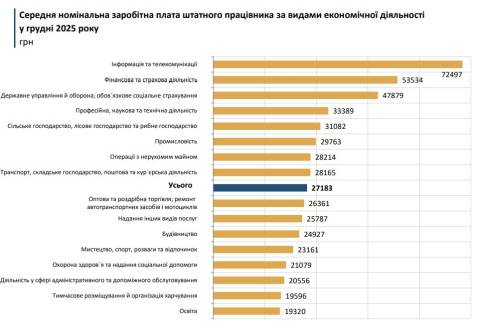 Найбільш оплачуваними у грудні були працівники підприємств та організацій інформації та комунікацій (72 497 грн), фінансової та страхової діяльності (53 534 грн), державного управління й оборони, обов’язкового соціального страхування (47 879 грн), професійної, наукової та технічної діяльності (33 389 грн).