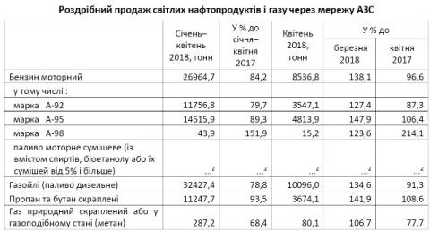 Зокрема, дизельного палива продали 32,4 тис.т, що на 21,2% менше, ніж у січні-квітні 2017 року, бензину – 27 тис.т (на 15,8% менше), пропану і бутану скраплених – 11,2 тис.т (на 6,5% менше).