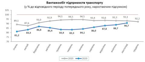 Вантажооборот підприємств транспорту становив 8811,9 млн.ткм і, порівняно з цими місяцями 2019 року, зменшився на 9,3%.