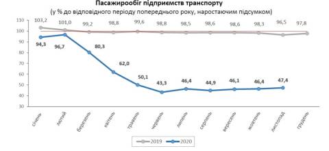 У січні-листопаді 2020 року послугами пасажирського транспорту скористалися 123,8 млн пасажирів, що на 42,3% менше, порівняно з цими місяцями 2019 року.
