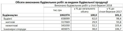 Натомість, порівняно з січнем-березнем 2017 року, скоротились на 6,2% обсяги робіт на будівництві житла.