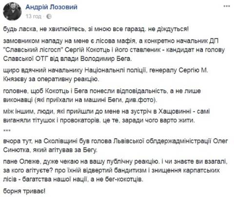 Як написав на своїй сторінці у Фейсбуці Андрій Лозовий, цей випадок був підлаштований начальником ДП "Славський лісгосп".