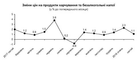 У лютому, порівняно з січнем, ціни на продукти харчування та безалкогольні напої зросли на 1,1%.