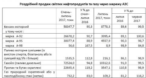 Зокрема, дизельного палива продали 72,5 тис.т, що на 5,2% менше, ніж у січні-липні 2016 року, бензину – 58,3 тис.т (на 9,7% менше), пропану і бутану скраплених – 22,6 тис.т (на 19,2% більше).