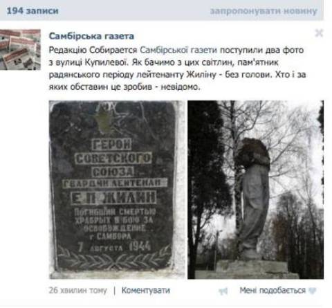 На вул. Купилевій у Самборі невідомі пошкодили пам'ятник, зведений у радянські часи, лейтенанту Е. П. Жиліну: пам'ятник залишився без голови.