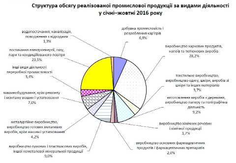 З видів діяльності переробної промисловості найбільше реалізовано продукції підприємствами з виробництва харчових продуктів, напоїв та тютюнових виробів (14,6 млрд грн), з виготовлення виробів з деревини, виробництва паперу та поліграфічної діяльності (4,8 млрд грн), з виробництва гумових і пластмасових виробів, іншої неметалевої мінеральної продукції (4,7 млрд грн), машинобудування (3,6 млрд грн).